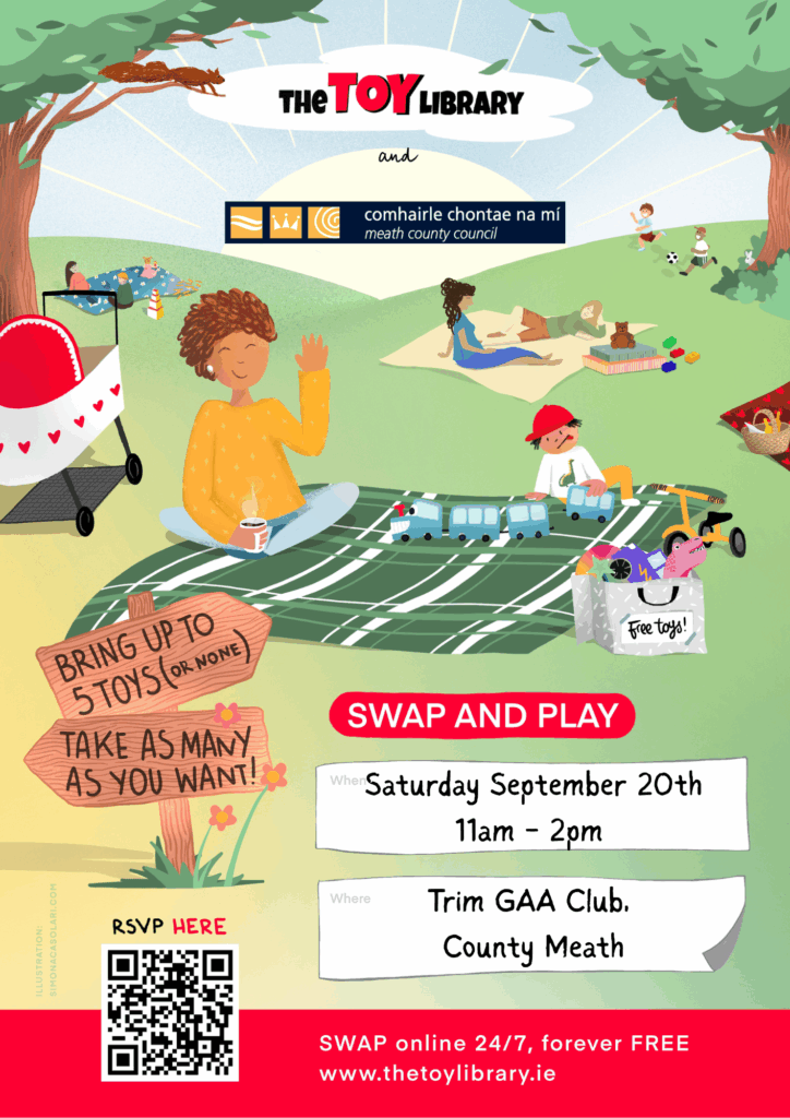 Join the Meath Climate Action Team on Saturday, 20 September | 11.00am–2.00pm at Trim GAA Club, Newhaggard Road County Meath C15 A258 a joyful day of toy swapping, eco-fun, and creative play!