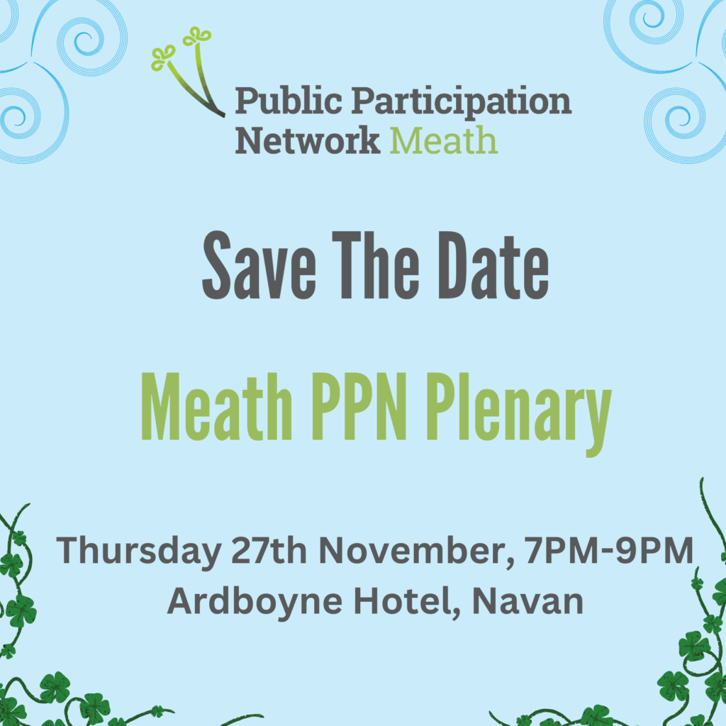 The next Meath PPN Plenary event will take place from 7-9pm on Thursday 27th November 2025 in the Ardboyne Hotel, Navan C15 C9YA
