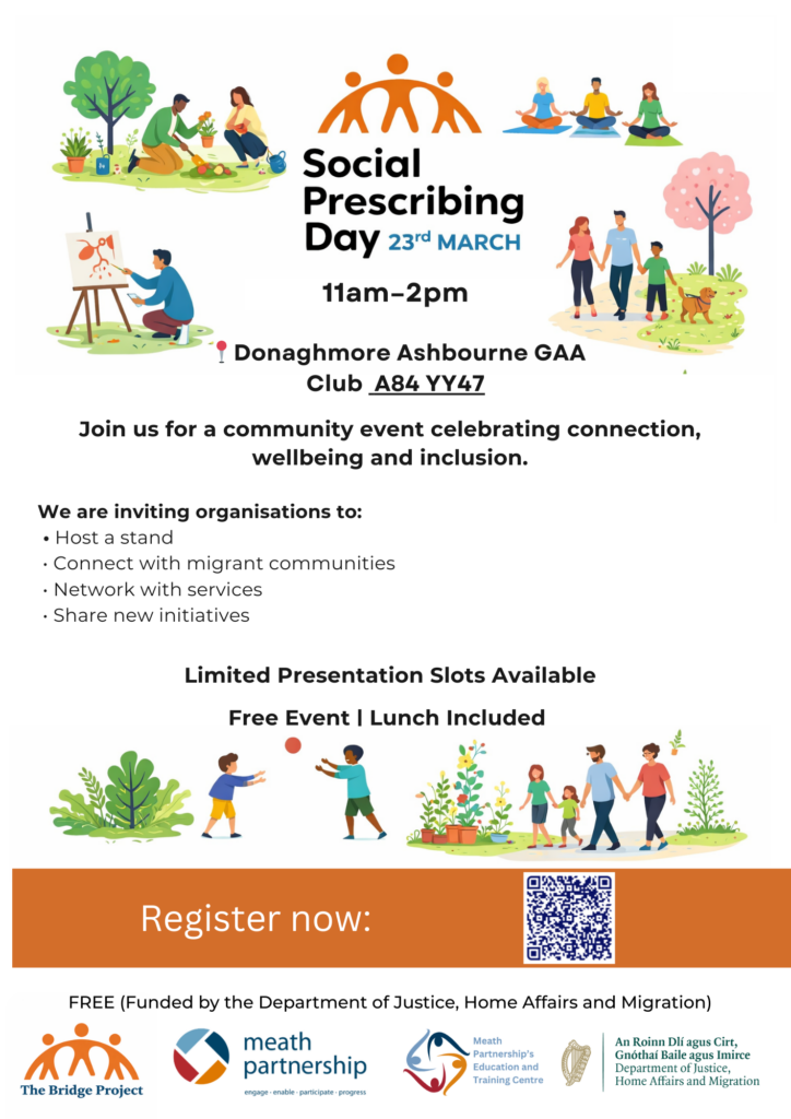 The Bridge Project’s first Social Prescribing Day, taking place on Monday, 23rd March 2025, from 11:00 to 14:00 at Donaghmore Ashbourne GAA Club (A84 YY47). This is an opportunity for local organisations to connect with migrant communities, network with other services, and share their initiatives.