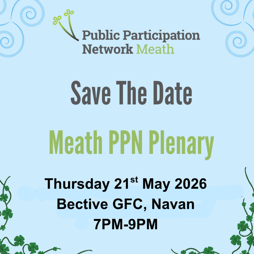 The next Meath PPN Plenary event will take place from 7pm on Thursday 2st May 2026 in Bective GFC, Cannistown, Navan, C15 TC59.